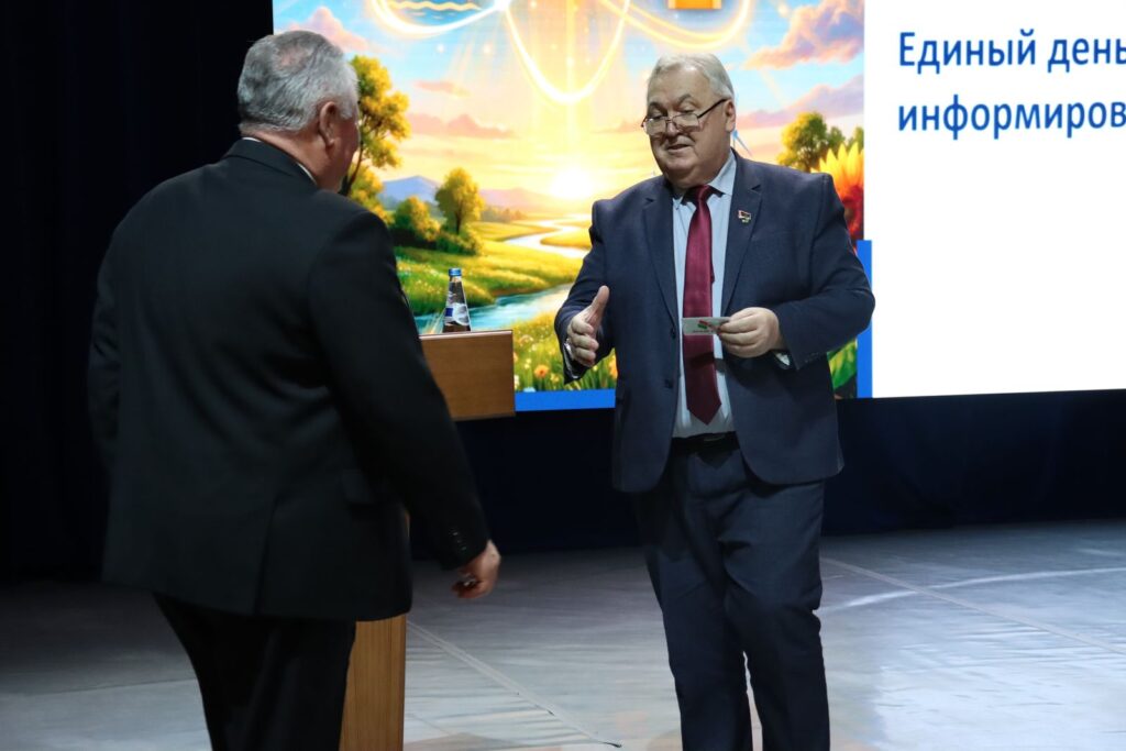 Завершающим торжественным аккордом Единого дня информирования стала церемония пополнения рядов одного из самых массовых общественных объединений страны. В торжественной обстановке сотрудникам Дворца Республики, принявшим решение активно участвовать в общественно-политической жизни страны, были вручены членские билеты РОО «Белая Русь».
